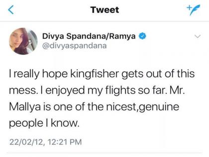 2012 साली रम्या यांनी काँग्रेस पक्षात प्रवेश केला होता. त्यानंतर किंगफिशर एअरलाईन्सच्या पडत्या काळातही रम्या यांनी मल्ल्या यांची समर्थन करणारी केलेली काही ट्विटस विरोधकांकडून समोर आणण्यात आली आहेत. विजय मल्ल्या हा चांगला व सच्चा माणूस आहे. किंगफिशर या सगळ्यातून लवकरच बाहेर पडेल, अशी आशा रम्या यांनी व्यक्त केली होती.