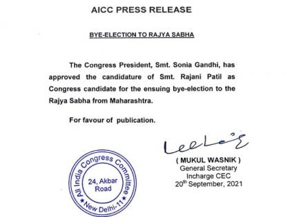 Congress President Smt. Sonia Gandhi has approved the candidature of Smt. Rajani Patil as Congress candidate for the ensuing bye-election to RS from Maharashtra. pic.twitter.com/0X8mS002jj