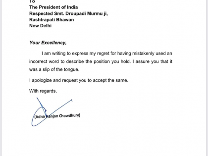 Rashtrapatni Remark: काँग्रेस नेते अधीर रंजन चौधरी (Adhir Ranjan Chowdhury) यांनी अखेर राष्ट्रपती द्रौपदी मुर्मू (Droupadi Murmu) यांना पत्र लिहून माफी मागितली आहे. चौधरी यांच्या 'राष्ट्रीयपत्नी' या शब्दावरुन जोरदार वाद सुरू आहे. दरम्यान, त्यांनी राष्ट्रपतींना पत्र लिहून म्हटले की, 'मी लिहून देतोय की, माझ्याकडून चुकीने तो शब्द निघाला. माझी जीभ घसरली, त्याबद्दल मी माफी मागतो आणि तुम्ही माफी स्वीकारावी ही विनंती."