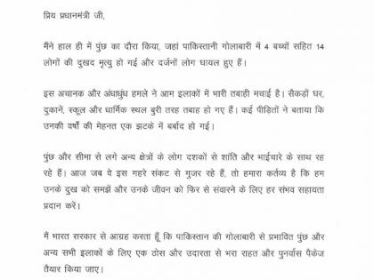लोकसभेचे विरोधी पक्षनेते राहुल गांधी यांनी पंतप्रधान नरेंद्र मोदी यांना एक पत्र लिहिले आहे. या पत्रात राहुल गांधी यांनी पूंछ आणि पाकिस्तानी गोळीबारामुळे प्रभावित झालेल्या इतर भागांसाठी मदत आणि पुनर्वसन पॅकेजची मागणी केली आहे. 'ज्याठिकाणी पाकिस्तानी गोळीबारात ४ मुलांसह १४ जणांचा दुर्दैवी मृत्यू झाला आणि अनेकजण जखमी झाले, पूंछमधील त्या ठिकाणाला मी अलिकडेच भेट दिली होती", असंही या पत्रात म्हटले आहे.