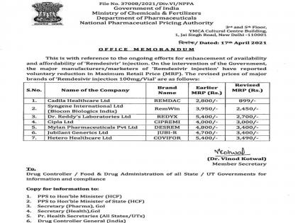 या इंजेक्शनची किंमत कमी करण्याचे आदेश केंद्र सरकारने दिले आहेत. या किंमती कमी करण्यासाठी, रासायनिक खते मंत्रालय उत्पादक कंपन्यांशी मागील 2 दिवसांपासून बैठक करीत होते. सरकार रिमडिसिव्हिर इंजेक्शनचे उत्पादन वाढविण्याबरोबरच किंमत कमी करण्याचा प्रयत्न करीत आहे.