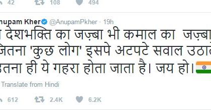 वेगळा मुद्दा घेऊन असहिष्णूतेची गँग परत आली आहे. त्यांच्या घोषणा वेगळ्या असल्या तरी चेहरे तेच आहेत असे एक ट्विट अनुपम खेर यांनी केले आहे. ट्विटवर हॅश-टॅग करताना त्यांनी #Intolerance #AwardWapsi #Emergency #DemonitisationDisaster #BharatKeTukde या शब्दांचा वापर केला आहे. आणखी एक ट्विट करताना त्यांनी देशभक्तीचा नारा लगवला आहे. देशभक्तीच्या प्रखर भावनेवर जितके प्रश्न उपस्थित केले जातात, तितकी देशभक्ती वाढत जाते, असे त्यांनी त्यात म्हटले आहे. अनुपम खेर यांना भाजपच्या जवळचे मानले जातात. गेल्या वर्षी जेएनयूमधील संघर्षातही त्यांनी उडी घेतली होती. अनुपम खेर यांच्या पत्नी किरण या भाजपच्या खासदार आहेत.