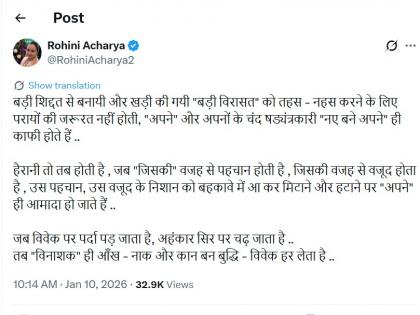 राष्ट्रीय जनता दलाच्या (आरजेडी) राजकारणात गेल्या अनेक दिवसांपासून सुरू असलेली अंतर्गत ओढाताण आणि पक्षाच्या निर्णयांवरून उपस्थित होणारे प्रश्न, या पार्श्वभूमीवर लालू प्रसाद यादव यांची कन्या रोहिणी आचार्य यांची एक नवी पोस्ट समोर आली आहे. रोहिणी यांनी 'एक्स' वर पोस्ट करत 'वारसा', 'ओळख', 'अस्तित्व' आणि 'आपल्या लोकांचं षडयंत्र' यावर भाष्य केलं आहे.