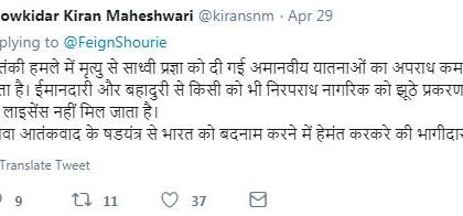 दहशतवादी हल्ल्यात मृत्यू झाला म्हणून, साध्वी प्रज्ञा यांना दिलेली अमानवीय छळाची वागणूक किंवा गुन्हा कमी होत नाही. प्रामाणिकपणा किंवा धाडसी बाणा दाखवल्यामुळे, कुठल्याही निरपराध नागरिकाला खोट्या प्रकरणात फसविण्याचा परवाना तुम्हाला मिळत नाही, असेही माहेश्वरी यांनी आपल्या ट्विटमध्ये म्हटले आहे.