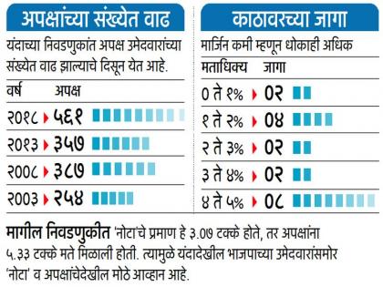 २०१३ साली झालेल्या निवडणुकांमध्ये भाजपाला ४९ जागा मिळाल्या होत्या. त्यातील २० जागांवर भाजपाचे उमेदवारांचे मताधिक्य हे पाच टक्के किंवा त्याहून कमी होते. दुसऱ्या टप्प्यातील निवडणुकांत अशा जागांची संख्या १८ इतकी होती. तर दुसºया टप्प्यात सहा जागांवर भाजपाचे उमेदवार कॉंग्रेस किंवा बसपाच्या उमेदवारांकडून अवघ्या पाच टक्के किंवा त्याहून कमी मतांच्या फरकाने पराभूत झाले होते. मागील १५ वर्षांपासून भाजपा छत्तीसगडमध्ये सत्तेत आहे. त्यामुळे सहाजिकच या सर्व जागांवर यंदा मते थोडीदेखील इकडे तिकडे गेली तर निकालांचे चित्र पालटण्याची शक्यता आहे. यातील बºयाचशा जागांवर अपक्षांना पडलेली मते तसेच ‘नोटा’चे प्रमाण हे लक्षणीय होते.
