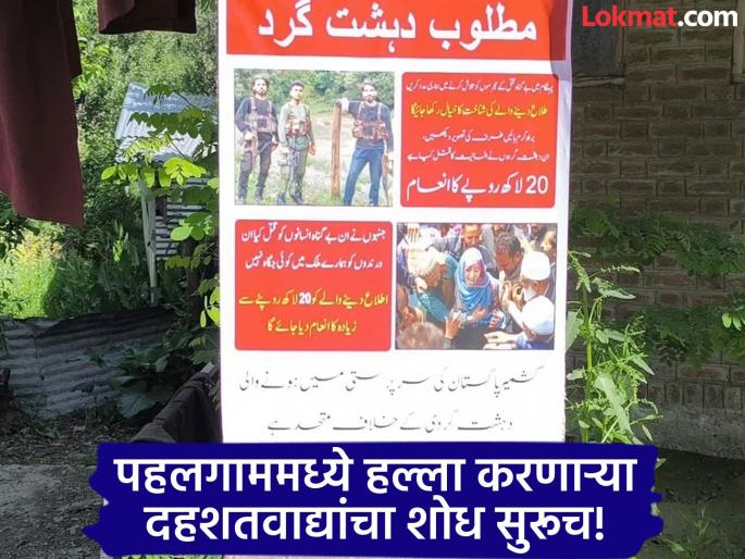 जम्मू आणि काश्मीरमधील पहलगामच्या बैसरण घाटीत फिरायला आलेल्या पर्यटकांवर गोळीबार करून त्यांची हत्या करणाऱ्या दहशतवाद्यांना शोधण्याचा सर्वोतोपरि प्रयत्न सुरक्षा यंत्रणा करत आहेत. पहलगाम दहशतवादी हल्ल्यातील गुन्हेगार अजूनही फरार आहेत. २२ एप्रिल रोजी झालेल्या हल्ल्यातील गुन्हेगारांचे फोटो सुरक्षा यंत्रणेकडून प्रसिद्ध करण्यात आले होते. त्यांना शोधून देणाऱ्या किंवा त्यांची माहिती देणाऱ्यास २० लाखांचं बक्षीस देखील जाहीर करण्यात आलं आहे. मात्र, अद्याप त्यांना पकडण्यात यश आलेलं नाही. आता या वॉन्टेड दहशतवाद्यांचे पोस्टर जम्मू-काश्मीरमध्ये ठिकठिकाणी लावले जात आहेत.