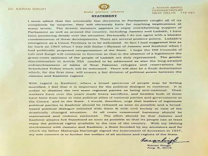 या निर्णयाबाबत देशभरामधून उमटत असलेल्या प्रतिक्रियांबाबत ते म्हणाले की,''केंद्र सरकारने घेतलेल्या या निर्णयाला जम्मू आणि लडाखसह संपूर्ण देशभरातून पाठिंबा मिळाला आहे. मी या परिस्थितीबाबत खूप विचार केला आहे. वैयक्तिक पातळीवर मी या निर्णयाला पूर्णपणे विरोध करण्याशी सहमत नाही. यामध्ये अनेक सकारात्मक पैलू आहेत. लडाखला केंद्रशासित करण्याचा निर्णय स्वागतार्ह आहे. खरंतर काश्मीर रियासतीचा सदर ए रियासत असताना १९६५ मध्ये मी हा सल्ला दिला होता.''
