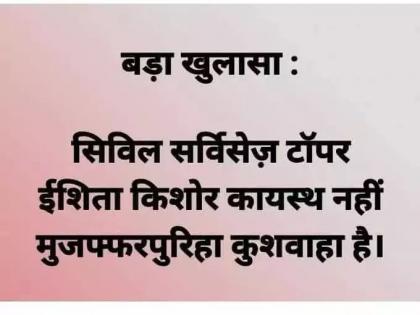 यावर्षीच्या सिव्हिल सर्व्हिसेस एक्शामिनेशनमध्ये मुलींनी बाजी मारली आहे. पहिल्या चार क्रमांकावर मुलींनीच कब्जा केला आहे. मात्र सोशल मीडियावर अशा गुणवान विद्यार्थ्यांची जात शोधली जात आहे. अशा उत्तीर्ण विद्यार्थ्यांना जातीच्या फेऱ्यात अडकवून त्यांना शुभेच्छा दिल्या जात आहेत. कुणी इशिताची जात यादव असल्याचं सांगत आहेत. तर कुणी ती कुशवाहा असल्याचा दावा करत आहेत. तर कुणी तिला ती यादव असल्याचं अधोरेखित करत शुभेच्छा दिल्या आहेत.