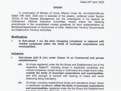या आदेशामध्ये शॉपिंग मॉल, शॉपिंग कॉम्प्लेक्सना परवानगी देण्यात आलेली नाही. देशात उद्यापासून काही व्यापारी व्यवहार होण्यास सुरुवात होऊ शकते. निवासी कॉलनीच्या जवळील दुकाने आणि स्टँड अलोन दुकाने आजपासून उघडण्याची परवानगी देण्यात आली आहे. यासाठी ही दुकाने नगरपालिका, महानगरपालिका क्षेत्रामध्ये असली पाहिजेत. तसेच शहरी सीमेच्या बाहेर येणाऱ्या दुकानांनाच परवानगी आहे. याशिवाय गृह मंत्रालयलाने काही अटीही लागू केल्या आहेत.