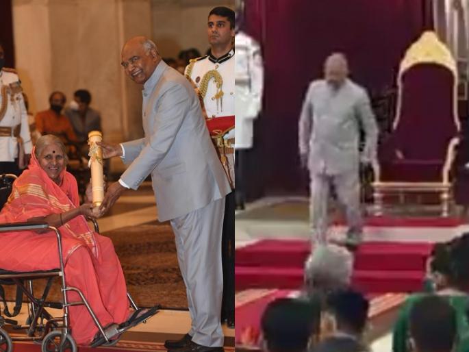 नवी दिल्ली - देशातील सर्वोच्च नागरी पुरस्कार असणाऱ्या पद्म पुरस्कारांचे वितरण राष्ट्रपती रामनाथ कोविंद यांच्या हस्ते करण्यात आले. प्रसिध्द उद्योजक रजनीकांत देविदास श्रॉफ यांना पद्मभूषण तर ज्येष्ठ सामाजिक कार्यकर्त्या सिंधुताई सपकाळ, गिरीश प्रभुणे यांच्यासह अन्य तीन मान्यवरांना पद्मश्री पुरस्कार प्रदान करून गौरविण्यात आले. अनाथांची माय म्हणून जगप्रसिद्ध असलेल्या सिंधुताई सपकाळ यांनी पुरस्कार स्विकारला. त्यावेळी, राष्ट्रपती कोविंद हे आपल्या खुर्चीवरुन पायऱ्या उतरुन खाली आले.
