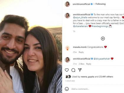 स्मृती इराणी यांनी शेअर केलेल्या फोटोमध्ये त्यांची कन्या शेनेल हिचा बॉयफ्रेंड अर्जुन भल्ला गुडघ्यावर बसून तिला साखरपुड्याची अंगठी घालताना दिसत आहेत. त्याशिवाय अन्य एका फोटोमध्ये शेनेल आणि अर्जुन रोमँटिक पोझमध्ये दिसत आहे.स्मृती इराणी यांनी जोडप्याचा फोटो शेअर करताना लिहिले की, ही पोस्ट त्या व्यक्तीसाठी ज्याने आम्हा सर्वांचे मन जिंकले आहे. आमच्या कुटुंबात तुमचं स्वागत आहे. तुम्हाला सासरे म्हणून एका अवलिया व्यक्तीचा सामना करावा लागणार आहे. ही माझी तुम्हाला अधिकृत सूचना आहे. गॉड ब्लेस...