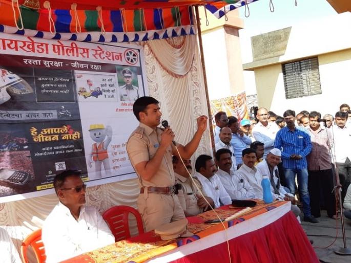 सटाणा : तालुक्यातील जायखेडा पोलीस ठाण्याच्यावतीने रस्ता सुरक्षा अभियान राबविण्यात येत आहे. या अंतर्गत नामपूर बाजार समिती आवारात हेल्मेट वापर तसेच रिफ्लेक्टरचा वापर याबाबत सहाय्यक पोलीस निरीक्षक गणेश गुरव, शेतकरी व व्यापारी आणि हमाल यांना मार्गदर्शन करून जनजागृती करण्यात येत आहे.या अंतर्गत नामपूर बाजार समिती आवारात आयोजित कार्यक्र माच्या अध्यक्षस्थानी बाजार समितीचे सभापती भाऊसाहेब भामरे होते. यावेळी सहाय्यक पोलीस निरीक्षक गणेश गुरव यांनी हेल्मेट सक्ती बाबत माहिती दिली. हेल्मेट घालून दुचाकी चालविणे, सीटबेल्ट लावून कार चालविणे, टॅÑक्टर ट्रॉलीच्या मागील बाजूस रिफ्लेक्टर लावणे अशा छोट्या परंतु महत्वाच्या बाबींची काळजी घेतल्यास अपघाताचे प्रमाण कमी होऊ शकते असेही त्यांनी सांगितले. यावेळी समितीचे उपसभापती लक्ष्मण पवार, संचालक कृष्णा भामरे, भाऊसाहेब अहिरे, अविनाश सावंत, भाऊसाहेब कांदळकर, संजय भामरे, दीपक पगार, हेमंत कोर, शांताराम निकम, मधुकर चौधरी, आनंदा मोरे, अविनाश निकम, दत्तू बोरसे, सचिन मुथा, चारु शीला बोरसे, चंद्रभागा शिंदे, अनिल बोरसे, दादाजी खैरनार, डॉ. दिग्पाल गिरासे, अरु ण अहिरे, शरद बोरसे, संजय पाटील आदी उपस्थित होते.हमाल करणार हेल्मेटचा जागर ...जायखेडा पोलीस ठाण्याच्या हेल्मेट वापराच्या आवाहनाला प्रतिसाद देत नामपूर बाजार समितीच्या माथाडी युनियन कामगारांनी तब्बल ८० हेल्मेटची मागणी केली आहे.प्रजासत्ताक दिनाचे औचित्यसाधून नामपूर गावातून हेल्मेट घालून मोटरसायक रेली काढून जनजागृती केली जाणार असल्याचे हमाल मापारी संचालक दत्तू बोरसे यांनी जाहीर केले.