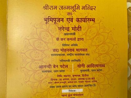 ५ ऑगस्ट रोजी दुपारी पंतप्रधान नरेंद्र मोदी यांच्या उपस्थितीत राम मंदिराचा भूमिपूजन सोहळा होणार आहे. या सोहळ्यासाठी पंतप्रधान नरेंद्र मोदी आणि आरएसएसचे प्रमुख मोहन भागवत हे विशेष अतिथी म्हणून उपस्थित राहतील, असे या निमंत्रण पत्रिकेत म्हटले आहे. निमंत्रण पत्रिकेमध्ये पंतप्रधान नरेंद्र मोदी आणि सरसंघचालक मोहन भागवत यांच्यासोबतच उत्तर प्रदेशच्या राज्यपाल आनंदीबेन पटेल आणि उत्तर प्रदेशचे मुख्यमंत्री योगी आदित्यनाथ यांच्या नावाचा समावेश आहे. तसेच निमंत्रक म्हणून श्रीराम जन्मभूमी तीर्थक्षेत्र ट्रस्टच्यावतीने अध्यक्ष नृत्यगोपाल दास यांच्या नावाचा निमंत्रण पत्रिकेत समावेश आहे.