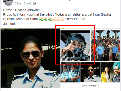 उर्वशी जरीवाला असे या महिला पायलटेच नाव असून ती गुजरातमधील सुरतची आहे. विशेष म्हणजे ती सुरतमधील भुलका भवन शाळेची विद्यार्थीनी असल्याचेही अभिमानाने सांगण्यात येत आहे. या भाजपा नेत्याप्रमाणेच अनेक व्यक्तिगत अकाऊंटवरुनही या पायलट उर्वशी यांचे फोटो व्हायरल केले जात आहेत. तसेच जरीवाला यांच्या फेसबुकचे स्क्रीनशॉटरी शेअर करण्यात येत आहेत. मात्र, यामागील सत्य वेगळंच आहे.