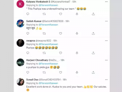 ही बातमी लिहिपर्यंत IFS अधिकाऱ्याच्या पोस्टला 3 हजाराहून अधिक व्ह्यूज आणि 155 रिट्विट्स मिळाले आहेत. तसेच, युजर्स या विषयावर आपली प्रतिक्रिया देत आहेत. एका यूजरने लिहिले - पुष्पाची पुंगी वाजली. दुसऱ्या युजरने लिहिले - शाब्बास सर, तुमच्या टीमसाठी टाळ्या. तर इतरांनी लिहिले की, पुष्पा पकडली गेली.