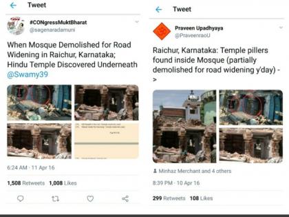 बंगळुरू - कर्नाटकमध्ये एक मस्जिद फोडल्यानंतर तेथे मंदिर आढळून आल्याची बातमी ट्विटरद्वारे व्हायरल झाली होती. कर्नाटकमधील रायचूर येथे रस्ते रुंदीकरण करताना एका मस्जिदला पाडण्यात आले. त्यावेळी हे मंदिर दिसून आले, त्यामुळे सर्वच मस्जिदींना पाडण्याची गरज असल्याचे या ट्विटमध्ये म्हटले होते. अनेक ट्विटर युजर्संने हे फोटो तशाच संदेशासह शेअर केला होता. रमानी परशुरामन यांनी सर्वप्रथम फेसबुकवरुन हा फोटो शेअर केला होता.