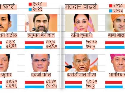हनुमान बेनीवाल यांच्या मतदारसंघात सर्वाधिक मतदान घटले तर, बाबा बालकनाथ यांच्या मतदारसंघात सर्वाधिक वाढले आहे.