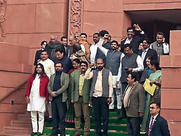 - लोकसभेत विरोधी पक्षनेते राहुल गांधी यांना भाषण पूर्ण करण्यास परवानगी न दिल्याबद्दल राज्यसभेत विरोधी खासदार घोषणाबाजी करत होते. त्यानंतर त्यांनी राज्यसभेतून सभात्याग केला व संसद भवनाच्या मकरद्वारातून घोषणा देत ते बाहेर पडले.