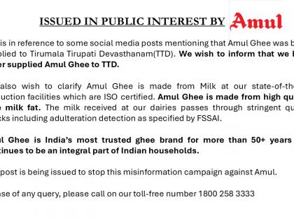 तिरुमला तिरुपती देवस्थानम (TTD) ला अमूल तूप पुरवठा केला जात असल्याचा उल्लेख काही सोशल मीडिया पोस्ट्समध्ये करण्यात आला आहे. अमूल कंपनीने कधीही तिरुमला तिरुपती देवस्थानमला अमूल तूप पुरवठा केलेला नाही. आम्ही हे देखील स्पष्ट करू इच्छितो की, अमूल तूप आमच्या अत्याधुनिक उत्पादन सुविधांमध्ये दुधापासून बनवले जाते, जे ISO प्रमाणित आहेत. अमूल तूप हे उच्च दर्जाच्या शुद्ध दुधाच्या फॅटपासून बनवले जाते. आमच्या डेअरीमध्ये मिळणारे दूध FSSAI द्वारे निर्दिष्ट केल्यानुसार भेसळ शोधण्यासह कडक गुणवत्ता तपासणीतून जाते. अमूल तूप ५० हून अधिक वर्षांहून अधिक काळ भारतातील सर्वात विश्वासार्ह तूप ब्रँड आहे आणि भारतीय घरांचा अविभाज्य भाग आहे. अमूलविरोधातील ही चुकीची माहिती देणारी मोहीम थांबवण्यासाठी ही पोस्ट जारी करण्यात येत आहे, असे अमूल कंपनीने एक्सवर म्हटले आहे.