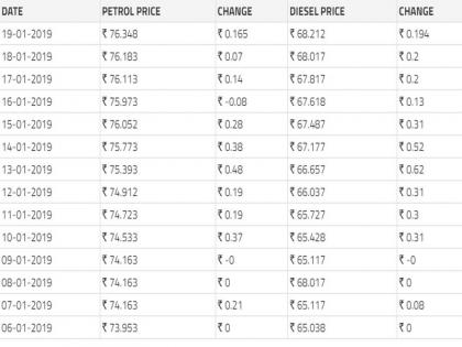 Petrol and diesel prices at Rs. 70.72/litre (increase by Rs 0.17) & Rs. 65.16/litre (increase by Rs. 0.19), respectively in Delhi. Petrol and diesel prices at Rs. 76.35/litre (increase by Rs. 0.17) & Rs. 68.22/litre (increase by Rs. 0.20), respectively in Mumbai. pic.twitter.com/ugxwcf9I46