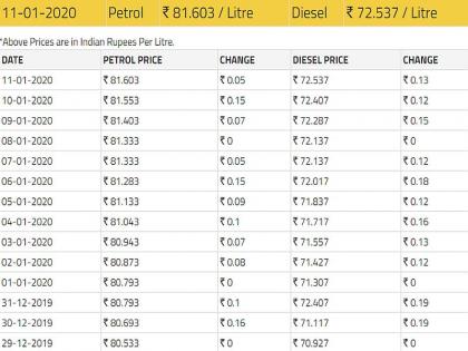 नवी दिल्ली - गेल्या काही दिवसांपासून इंधनाच्या दरात वाढ होत आहे. पुन्हा एकदा इंधन दरवाढीचा भडका उडाला आहे. शनिवारी (11 जानेवारी) पेट्रोल आणि डिझेलच्या दरात वाढ झाली आहे. मुंबईत आज पेट्रोल 5 पैशांनी महागलं आहे. त्यामुळे मुंबईकरांना आज पेट्रोलसाठी 81.60 रुपये मोजावे लागतील. तर डिझेलच्या दरात वाढ 13 पैशांची वाढ झाली. त्यामुळे मुंबईत डिझेलचा दर 72.53 रुपये आहे. सलग तिसऱ्या दिवशी इंधनाच्या दरात वाढ झाली असून गेल्या तीन दिवसांत मुंबईत पेट्रोल 27 पैशांनी तर डिझेल 40 पैशांनी महागले आहे.