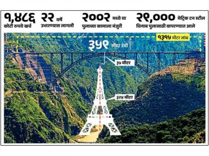 २००२मध्ये अटलबिहारी वाजपेयी सरकारने या चिनाब पुलाच्या कामाला मंजुरी दिली होती. आता या पुलामुळे कटरा-श्रीनगर रेल्वे मार्ग सुरू झाल्यानंतर काश्मीर खोऱ्यात आरामदायी प्रवास करत लवकर पोहोचणे शक्य होणार आहे. चिनाब पुलाच्या बांधकामामुळे नदीच्या प्रवाहात कोणताही अडथळा निर्माण झालेला नाही तसेच नदीच्या पात्रात पुलासाठी खांबही उभारण्यात आलेले नाहीत. त्यामुळे हा पूल पर्यटकांसाठी खास आकर्षण ठरला असल्याचे सूत्रांनी माहिती देताना सांगितले.