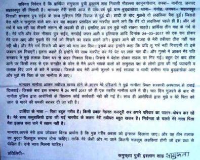 शगुफ्ता शाह यांनी पंतप्रधान मोदींसोबत उत्तर प्रदेशचे मुख्यमंत्री योगी आदित्यनाथ यांना पत्र लिहिलं आहे. '24 मार्च रोजी आपला पती आणि सासरच्यांनी गर्भपात करण्यासाठी आपल्यावर जबरदस्ती केली. आपण नकार दिल्यानंतर मारहाण करण्यात आली. यावेळीच आपल्या पतीने तलाक तीन वेळा म्हणत आपल्याला घराबाहेर काढल्याचं', शगुफ्ता शाह यांनी सांगितलं आहे.