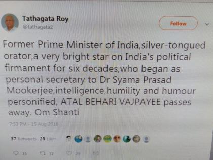 तथागत रॉय यांनी ट्विट करुन अटल बिहारी वाजपेयी यांच्या निधनाबद्दल दु:ख व्यक्त केलं. 'भारताचे माजी पंतप्रधान, उत्तम वक्ते आणि सहा दशकांपासून राजकीय क्षितिजावर चमकणारे, डॉ. श्यामा प्रसाद मुखर्जी यांचे खासगी सचिव म्हणून कारकिर्दीची सुरुवात करणारे, अतिशय बुद्धिमान आणि विनम्र असणारे अटल बिहारी वाजपेयी यांचं निधन झालं आहे. ओम शांती,' असं ट्विट रॉय यांनी केलं होतं. यानंतर नेटिझन्सनी रॉय यांना ट्रोल करण्यास सुरुवात केली.