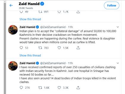 या चर्चेदरम्यान @ZaidZamanHamid हे ट्विटर हँडल चर्चेत आलं आहे. हा माणूस आयएसआयचाच हस्तक असून तो काश्मिरी जनतेमध्ये भारताबद्दल विष कालवण्याचा प्रयत्न करत असल्याचा दावा केला जातोय. त्याची काही ट्विट पाहिली तर त्यातून त्याच्या भारतद्वेषाची कल्पना येऊ शकते. अशा माणसाचं अकाउंट ट्विटर व्हेरिफाईड (नावापुढे ब्लू टिक)असूच कसं शकतं?, हा प्रश्न या निमित्ताने विचारला जातोय.