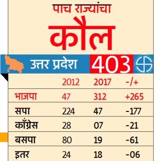 राजकीयदृष्ट्या देशातील सर्वाधिक महत्त्वाचे राज्य उत्तर प्रदेशात भारतीय जनता पार्टीचा वनवास अखेर संपला आहे. पक्षाने तब्बल १४ वर्षांनंतर राज्यात एकहाती सत्ता काबीज करीत नवा इतिहास रचला आहे. भाजपाने त्याचे मित्रपक्ष अपना दल (सोनेलाल पटेल) आणि भारतीय समाज पार्टी (सुहेलदेव) यांच्या सोबतीने तिहेरी शतक ठोकून विरोधकांना अक्षरश: पळता भुई थोडी केली. राज्यातील एकूण ४०३ पैकी ३२४ जागा या आघाडीने प्राप्त केल्या आहेत. यापूर्वी १९९१ साली पक्षाने रामजन्मभूमी आंदोलनाच्या आधारे उत्कृष्ट कामगिरी बजावत राज्यातील ४२५ जागांपैकी २२१ जागांवर विजय संपादित केला होता. दुसरीकडे राज्यातील लोकांनी सपा नेते अखिलेश यादव आणि काँग्रेस उपाध्यक्ष राहुल गांधी यांचा ‘यूपी को साथ पसंद है’ हा नारा सपशेल फेटाळला, तर बसपाच्या मायावती यांनाही पुन्हा एक संधी देण्यास नकार दिला आहे. गेल्या लोकसभा निवडणुकीत बसपाची जी दैनावस्था झाली होती तशीच यंदाही झाली. उत्तराखंडातही भाजपाने एकूण ७० पैकी ५७ जागांवर ताबा मिळवीत प्रचंड बहुमत प्राप्त केले आहे, तर सत्ताधारी काँग्रेसची धूळधाण उडाली आहे.