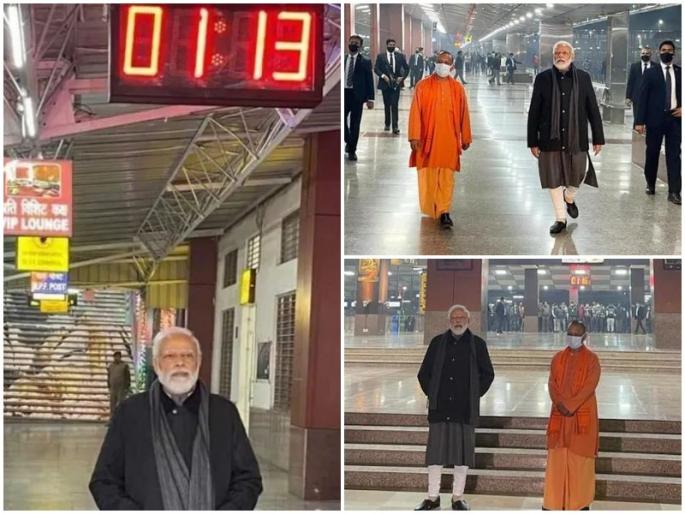 वाराणसी - पंतप्रधान नरेंद्र मोदीवाराणसी दौऱ्यावर आहेत. त्यांनी येथे सोमवारी काशी कॉरिडॉरचे उद्घाटन केले. तसेच मंदिर परिसरात सुरू असलेल्या कामाचाही आढावा घेतला. यानंतर त्यांनी क्रूझ राईड केली. नंतर ते अस्सी घाट आणि संत रविदास घाटावर पोहोचले. येथे त्यांनी संत रविदासांना नमन केले. एवढेच नाही, तर उत्तर प्रदेशचे मुख्यमंत्री योगी आदित्यनाथ यांच्यासोबत पीएम मोदी रात्री उशिरा वाराणसी स्टेशनवर पोहोचले. पीएम मोदींनी वाराणसी स्टेशनचे काही फोटोही शेअर केले आहेत.