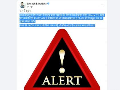 "आज देहरादून परेड ग्राउंडवर शपथविधी सोहळ्यादरम्यान माझा मोबाईल फोन (iPhone 13) कुठेतरी पडला आहे. अशा परिस्थितीत तुमच्यापैकी कोणाकडे मोबाईल आला तर तुम्ही माझ्या फेसबुक पेजवर मला संपर्क करा. माझ्या संपर्क क्रमांकावरून कोणताही कॉल आला तर कृपया काळजी घ्या", असं भाजप सरकारचे मंत्री सौरभ बहुगुणा यांनी त्यांच्या फेसबुक पोस्टमध्ये म्हटलं आहे.