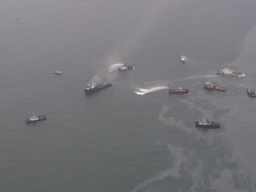 जीव वाचविण्यासाठी या पेटत्या जहाजावरील खलाशांनी समुद्रात उड्या मारल्या.