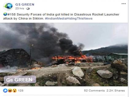 नवी दिल्ली: लडाखमध्ये भारत आणि चीनचं सैन्य आमनेसामने आलं आहे. त्यामुळे सीमावर्ती भागातला तणाव वाढला आहे. त्यातच आता सोशल मीडियामध्ये एक फोटो व्हायरल झाला आहे. चिनी सैन्यानं सिक्कीममध्ये भारतीय जवानांवर रॉकेट हल्ला केल्याचा दावा यामध्ये केला जात आहे. यामध्ये भारताचे १५८ जवान शहीद झाल्याचाही दावा करण्यात आला आहे.