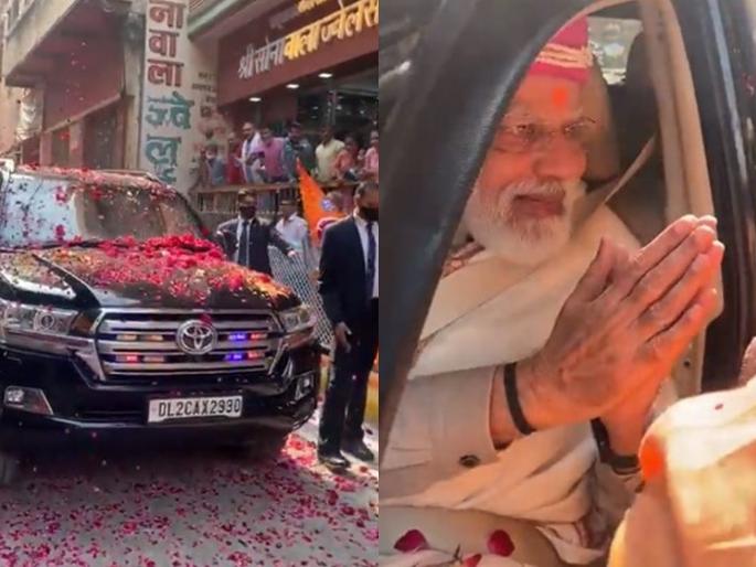 वाराणसीच्या गल्ली-बोळातून मोदी कालभैरव मंदिरात दर्शनासाठी पोहोचले. यावेळी, लोकांनी जल्लोषात मोदींचे स्वागत केले, मोदींच्या नावाचा जयघोष करत त्यांच्या गाडीवर पुष्पवृष्टीही करण्यात आली. मोदी मोदी आणि हर हर महादेव या घोषणांनी वाराणसीच्या गल्ली बोळात आसमंत दणाणून गेल्याचं पाहायला मिळालं. मोदींच्या गाडीवर करण्यात आलेल्या पुष्पवृष्टीचा व्हिडिओ सध्या व्हायरल होत आहे.