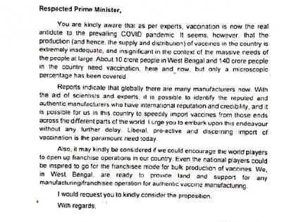 "आपण आंतरराष्ट्रीय लस उत्पादकांना भारतात फ्रेन्चायझी उघडण्यासाठी आमंत्रित करू शकतो. तसंच आपल्या देशातील कंपन्याही फ्रेन्चायझी मोडवर काम करू शकतात. जेणेकरून अधिक लस उत्पादन करता येईल. आम्ही बंगालमध्ये कंपन्यांना फ्रेन्चायझी सुरू करण्यासाठी जमिन आणि सहकार्य देण्यास तयार आहोत," असंही त्यांनी पत्रात म्हटलं आहे.