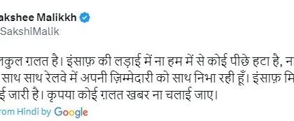 ''माध्यमांमध्ये येणाऱ्या बातम्या खोट्या आहेत. सत्याच्या लढाईतून आम्ही माघार घेतली नाही आणि घेणारही नाही. सत्याग्रहासोबत रेल्वेतील जबाबदारी निभावणार आहे. न्याय मिळेपर्यंत आमची लढाई सुरू राहणार,'' असे ट्विट साक्षीने केले.