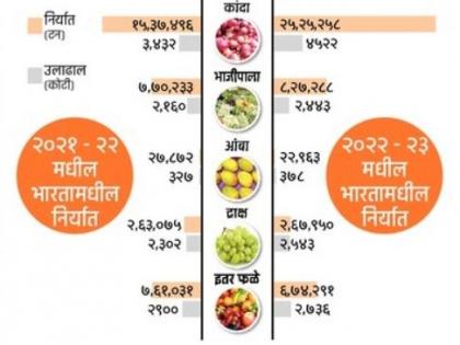 २०२० - २१ मध्ये १५ लाख ७८ हजार टन कांद्याची निर्यात होऊन २८२६ कोटी रुपयांची उलाढाल झाली होती. २०२१ - २२ मध्ये १५ लाख ३७ हजार टन कांद्याची निर्यात होऊन ३४३२ टन उलाढाल झाली होती. २०२२ - २३ या आर्थिक वर्षात विक्रमी २५ लाख २५ हजार २५८ टन निर्यात होऊन ४५२२ कोटी रुपयांची उलाढाल झाल्याचे समोर आले आहे.