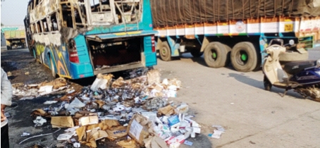 राज्याच्या अनेक भागांतील प्रवाशांसाठी चालविल्या जाणाऱ्या खासगी ट्रॅव्हल्सचे जाळे मुंबईसह ठाणे व नवी मुंबईला जोडले गेलेले आहे. त्यानुसार नवी मुंबईतून दररोज शेकडो ट्रॅव्हल्स ये-जा करतात. लॉकडाऊनमध्ये ट्रॅव्हल्सला लागलेला ब्रेक आता अनलॉकमध्ये हटला आहे. परंतु प्रवासी वाहतुकीला परवानगी असताना बहुतांश ट्रॅव्हल्स कुरियरच्या सामानाची वाहतूक करण्यासाठी वापरल्या जात आहेत. ट्रान्सपोर्ट कंपनीमार्फत होणारा खर्च टाळण्यासाठी स्वस्तात ट्रॅव्हल्समधून एका ठिकाणावरून दुसऱ्या ठिकाणापर्यंत मालवाहतूक करण्यात येत आहे. मात्र त्यामुळे अपघातांच्या घटना घडत आहेत. याच पार्श्वभूमीवर दोन वर्षांपूर्वी खासगी ट्रॅव्हल्समधून मालवाहतुकीवर बंदी घालण्यात आली आहे. परंतु ही बंदी केवळ कागदावरच असल्याचे प्रत्यक्षात पाहायला मिळत आहे. परिणामी, प्रवाशांवर मृत्यूची टांगती तलवार लटकत आहे. अशाच प्रकरणातून शनिवारी ३५ प्रवाशांच्या जीविताला धोका निर्माण झाला होता. आकांक्षा ट्रॅव्हल्सची बस मुंबईकडे येत असताना सानपाडा येथे बसला आग लागली. बसमधील कुरियरचे साहित्य उतरविले जात असताना ही दुर्घटना घडली. घटनेवेळी बसमध्ये ३५ प्रवासी होते, त्यापैकी एकाला दुखापत झाली आहे. तर बस थांबलेली असल्याने प्रवाशांनी तत्काळ बाहेर पळ काढल्याने त्यांचे प्राण वाचले.बसला लागलेली आग विझविताना बसच्या डिक्कीत औषधे व इतर सामान असल्याचे आढळून आले. त्यात सॅनिटायझरचादेखील साठा होता असे समजते. त्यामुळेच क्षणांत संपूर्ण बस जळून खाक झाली.