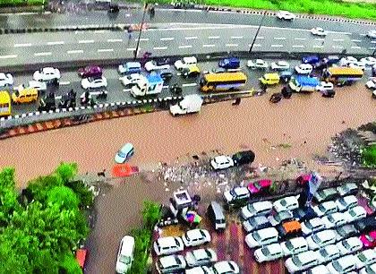 खारघरपासून सुरू झालेली वाहतूककोंडी बेलापूर खिंडीपर्यंत पोहचली होती तर दुसºया मार्गावरील वाहतूक खारघर टोल नाक्याच्या पुढे गेली होती. नाला फुटल्याने अचानक पाण्याचा प्रवाह वाढल्याने कोपरा पुलाखालून जाणाºया गाड्या मोठ्या संख्येने उड्डाणपुलाखाली अडकल्या होत्या. पाण्याला वेग असल्याने अनेक चालकांनी वाहने पाण्यातच सोडून दिली. घटनेची माहिती मिळताच पनवेल महापालिकेच्या कर्मचाऱ्यांनी घटनास्थळी धाव घेतली. कोपरा नाल्यावरच खारघर शहरात जाण्यासाठी एक पूल उभारण्यात आला आहे.