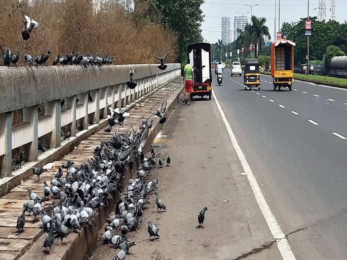 नवी मुंबई : पामबीच रोडवर नेरूळ व सानपाडामधील पुलाच्या कठड्यावर नागरिक पक्ष्यांसाठी धान्य ठेवू लागले आहेत. यामुळे येथे कबुतरांची संख्या मोठ्या प्रमाणात वाढली असून त्यामुळे अपघात होण्याची शक्यता वाढली आहे. येथे धान्य टाकू नये याविषयी जनजागृती करण्याची मागणीही केली जात आहे.