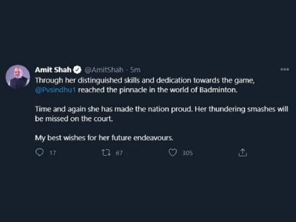 ''विशिष्ट कौशल्य आणि खेळाप्रती असलेल्या समर्पणाच्या जोरावर तिनं जागतिक बॅडमिंटनमध्ये स्वतःचा ठसा उमटवला आहे. तिनं देशासाठी अभिमानास्पद कामगिरी केली आहे. तिचं विजेच्या वेगाने येणारा स्मॅश आता आपण मिस करू. पुढील वाटचालीसाठी तिला शुभेच्छा,''असं अमित शाह यांनि ट्विट केलं होतं. खरं तर सिंधूनं सध्याच्या कोरोना परिस्थितीमुळे आलेल्या नकारात्मक बाबींना निवृत्त करण्याची पोस्ट लिहिली होती. पण, तिच्या पोस्टनं अनेकांचा गोंधळ उडाला.
