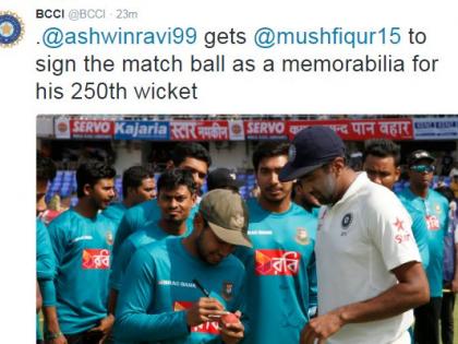अश्विनने बांगलादेशचा कर्णधार मुशफिकूर रहिमची विकेट काढत कसोटी कारकीर्दीतील 250 बळींचा टप्पा ओलांडला होता त्यामुळे आज सामना संपल्यानंतर सामन्यातील त्या चेंडूवर मुशफिकूर रहिमची स्वाक्षरी घेतली आहे.