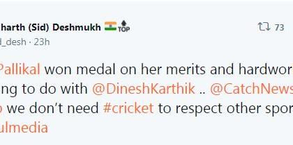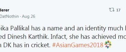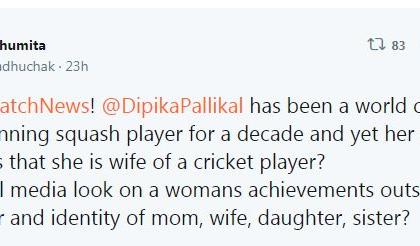 दीपिकाने कांस्यपदक जिंकले आणि त्याचे कौतुक करताना इंग्रजी वेबसाईटने क्रिकेटपटू दिनेश कार्तिकच्या पत्नीने आशियाई स्पर्धेत पदक जिंकले असा उल्लेख केला. मग काय सोशल मीडियावर टीकांचे बाण सुटले. हे पदक दीपिकाने स्वकर्तुत्वावर जिंकले आहे, कार्तिकमुळे नाही, असे अनेक टीकांचे मॅसेज त्या वेबसाईटवर पडू लागले.