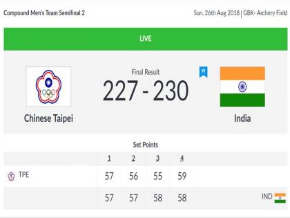 #Archery भारताच्या पुरुष तिरंदाजांनी कम्पाऊंड गटाच्या सांघिक गटाच्या अंतिम फेरीत प्रवेश केला. उपांत्य फेरीच्या सामन्यात त्यांनी चायनीज तैपेईचे आव्हान 230-227 असे मोडून काढले. रजत चौहान, अमन सैनी आणि अभिषेक वर्मा यांचा भारतीय संघात समावेश आहे.