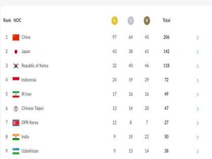 चीनची या स्पर्धेतील कामगिरी नेत्रदीपक अशीच आहे. कारण सुवर्णपदकांचे शतक पूर्ण करण्यासाठी त्यांना फक्त चार पदकांची गरज आहे. चीनने आतापर्यंत 96 सुवर्ण, 64 रौप्य आणि 45 कांस्य अशी एकूण 205 पदके आहेत. पदकतालिकेत दुसरे स्थान जपानने कायम ठेवले आहे. जपानच्या खात्यामध्ये 43 सुवर्ण, 38 रौप्य, 60 कांस्य अशी एकूण 141 पदके आहेत. पदकतालिकेत तिसरा क्रमांक दक्षिण कोरियाने पटकावला आहे. कोरियाने आतापर्यंत 32 सुवर्ण, 39 रौप्य आणि 46 कांस्य अशी एकूण 117 पदके पटकावली आहेत.