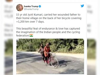 इव्हांका ट्रम्पने ट्विट केलं की,'' 15वर्षीय ज्योती कुमारीनं तिच्या आजारी वडिलांना सायकवरून सात दिवस 1200 किमी प्रवास केला. भारतीय लोकांच्या कल्पनाशक्तीनं मला हे सहनशक्ती व प्रेमाचे सुंदर चित्र पाहायला मिळाले.''