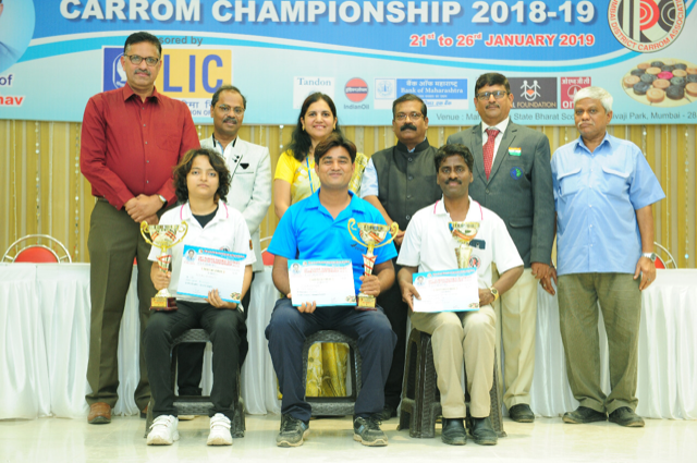 महाराष्ट्र कॅरम असोसिएशनचे उपाध्यक्ष व अखिल भारतीय कॅरम महासंघाचे असोसिएट उपाध्यक्ष शांताराम गोसावी, भारतीय आयुर्विमा महामंडळाच्या वरिष्ठ व्यापार सहयोगी डॉ स्नेहा परब, महाराष्ट्र कॅरम असोसिएशनचे उपाध्यक्ष दीपक पाटील, मानद सरचिटणीस यतीन ठाकूर, खजिनदार अरुण केदार व आंतर राष्ट्रीय पंच जनार्धन संगम यांच्या हस्ते विजेत्यांना रोख पारितोषिके व चषक देऊन गौरविण्यात आले.