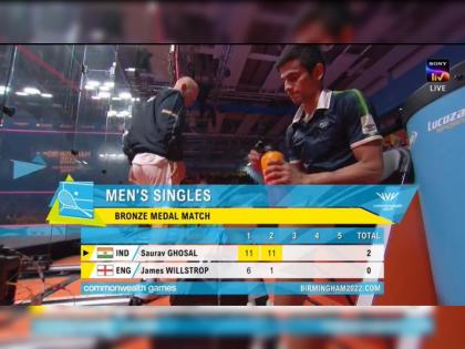 #Squash men's singles bronze medal match त्याच्यासमोर इंग्लंडच्या जेम्स विलस्ट्रॉफचे आव्हान होते आणि त्याच्याविरुद्धची सौरवची जय-पराजयाची आकडेवारी ही १-८ अशी निराशाजनक होती. पण, त्याने पहिल्या गेममध्येच ११-६ असा झटपट विजय मिळवून १-० अशी आघाडी घेतली. दुसऱ्या गेममध्ये सौरवने ८-१ अशी मजबूत आघाडी मिळवली होती आणि त्यानंतर सलग तीन गुण घेत हा गेमही ११-१ असा जिंकून २-० अशी आघाडी मजबूत केली.