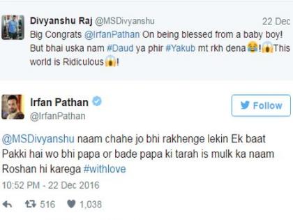सैफ अली खान आणि करिनाने आपल्या मुलाचं नाव तैमूर ठेवल्यावरुन अनेकांनी सोशल मीडियाच्या माध्यमातून टीका करत नावाला विरोध केला होता. यामुळे अनेक वादही निर्माण झाले. याच पार्श्वभुमीवर एका व्यक्तीने इरफान पठाणला 'मुलगा झाल्याबद्दल शुभेच्छा, पण त्याचं नाव दाऊद किंवा याकूब ठेवू नका, हे जग हास्यास्पद आहे', असा सल्ला दिला.